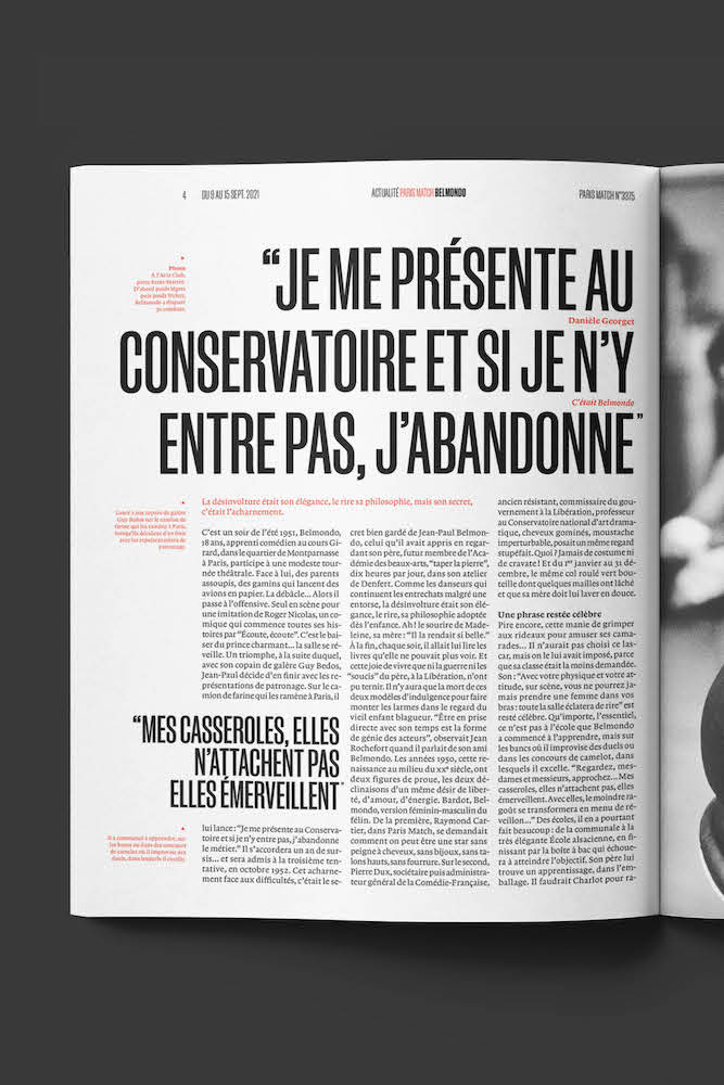 Proposition de refonte de la maquette de Paris Match, magazine hebdomadaire emblématique de la presse française. Nous avons d'abord collectivement réalisé une analyse approfondie du dispositif typographique et graphique de la maquette actuelle, des différents niveaux de lecture, de la structure éditoriale, de l’iconographie, de la grille et du rédactionnel.